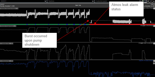 Atmos system data showing the pressure drop and automated high priority leak alarm at the point of failure