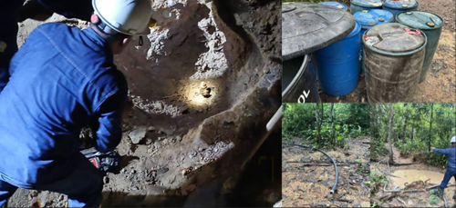 Figure 3: Theft site location (left), the barrels used to store the stolen fuel (top right), and the hose used to transport the fuel between the tap and the barrels (bottom middle and right)
