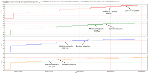Figure 2: Hydrogen blend maximum capacity calculated by Atmos SIM (Red 0%, green 10%, blue 25% and orange 50%) in an example pipeline network