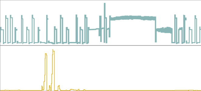 Figure 5: 30 hours of data from the web GUI. The top chart shows peak-to-peak pressure data and the bottom trend shows the rate of pressure drop during shut-in. On the left side of the graphs, a higher rate of pressure drop can be seen during two shut-in periods, indicating a potential leak.