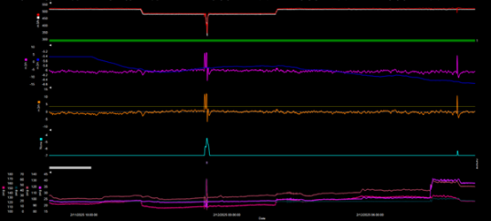 Figure 2: Example operational trend data from a tailings pipeline illustrating flow variability, pressure transients and detection of abnormal hydraulic conditions (from the top: trend 1 - inlet and outlet flow, trend 2 and 3 - raw, average flow difference and corrected flow difference, trend 4 - statistical parameter, trend 5 - pressure)