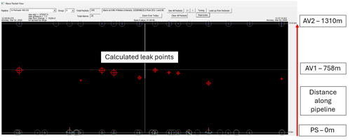 Figure 6: Detection results showing controlled leak events and their estimated locations (actual leak location shown in dotted white line: AV1 - 780m)
